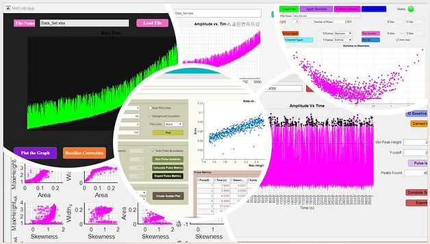 As part of a course modernization initiative, graduate students in this intensive 7-week analytical chemistry program were tasked with developing a custom application using MATLAB App Designer. The app was designed to baseline-correct fluctuating temporal pulse traces, isolate individual pulses, and extract key waveform metrics, including skewness, kurtosis, area, peak maximum, and width. Additionally, students were introduced to the MATLAB Classification Learner app. This project serves as a technical foundation, enabling them to transition into machine learning workflows and apply advanced data analysis to their own doctoral research. A Cumulative snapshot of some of the apps developed by the students is shown below.